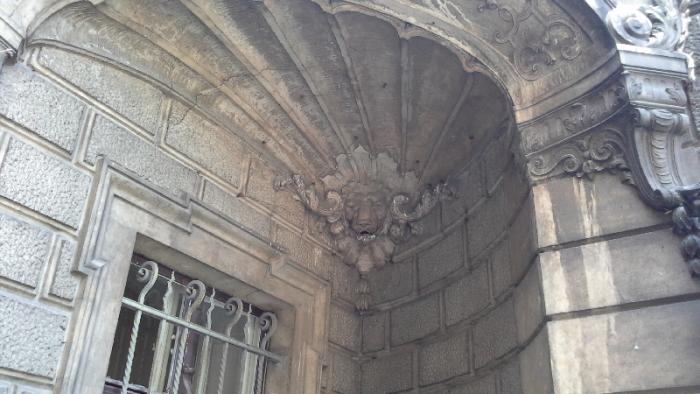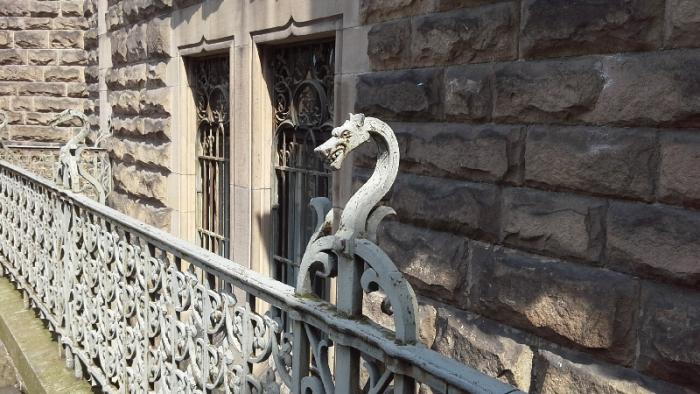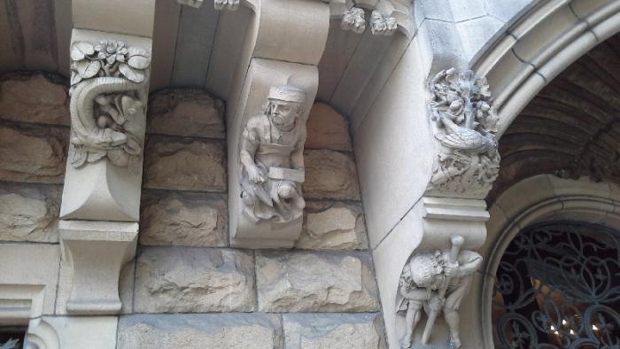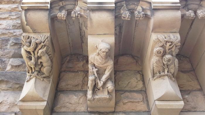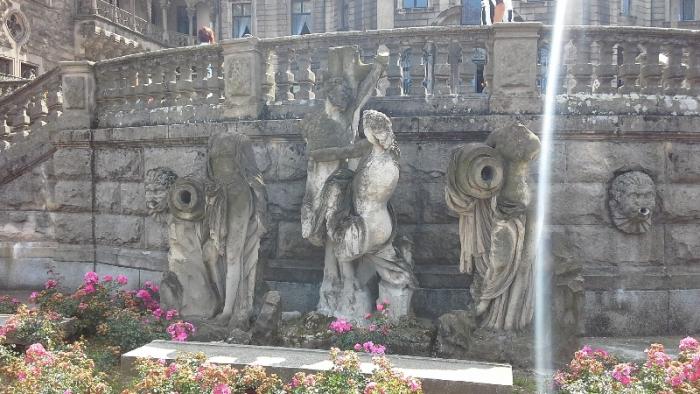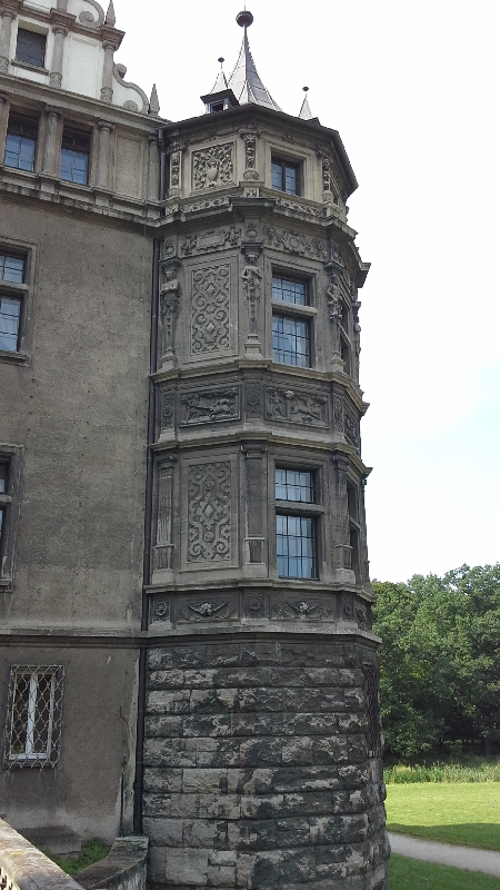 Ну а вблизи на фронтонах и барельефах вообще такие занятные фигурки: дракончики, гномики и другие сказочные персонажи.И вообще замок кажется сказочным исполинам среди полей и рощ этой части Польши