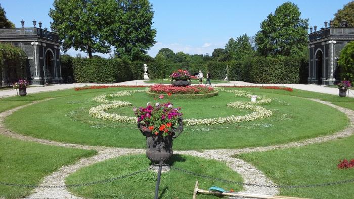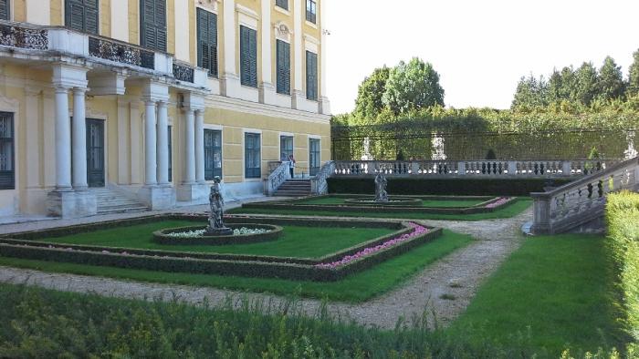 День предстоял напряженный, поэтому объявил своим девочкам ранний подъем и завтрак. покинули гостеприимный отель, настроил навигатор на Шенбрунн и поехали. Ехать недалеко 7 км, подъехали начали искать стоянку рядом с парком, сделали круг не нашли подходящего места пришлось по указателю ехать 500 м. Там была большая подземная стоянка, оставили автомобиль и пошли пешком ко входу в парк.По дороге увидел интересную картину: на переходе через трамвайные пути группа детишек 8-9 лет во главе с учительницей, все были одеты в одинаковые желтые манишки, чтобы ярко желтые цвета их видели все водители транспортных средств.У входа к дворцу было много народу, зашли в Центр для посетителей, там продаются билеты во Дворец, сувениры, находится информационный центр, где можно получить карту Паркового ансамбля на разных языках.Вход в сам парк свободный так что можно свободно гулять и наслаждаться красотами парка.