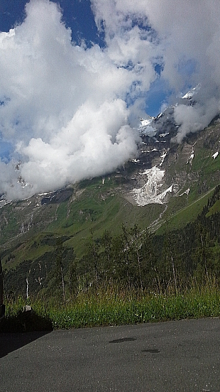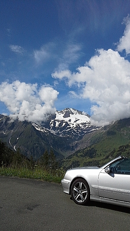 Машина, попавшая на этот снимок кстати была с номерами Канады.Глоссглокнер привлекает к себе и автотуристов с американского континента.А вот показалась вершина горы Глоссглокнер