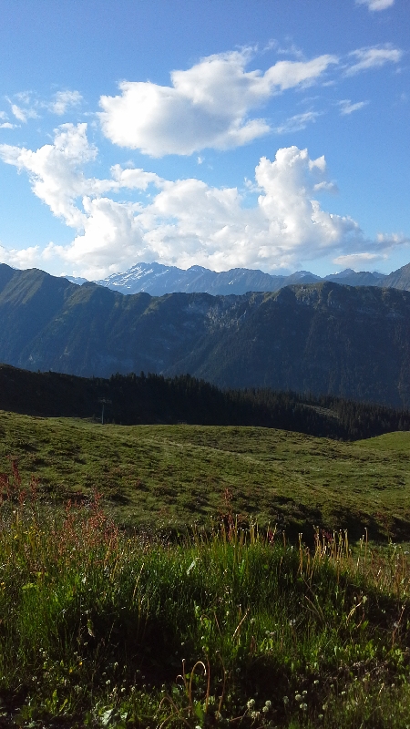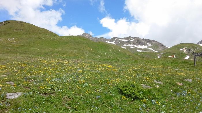 Здесь наверху уже 14 градусов.Но погода чудесная, светит солнце.Остановились, чтобы сфотографировать альпийские луга.вокруг звенят колокольчики знаменитых молочных альпийских коров