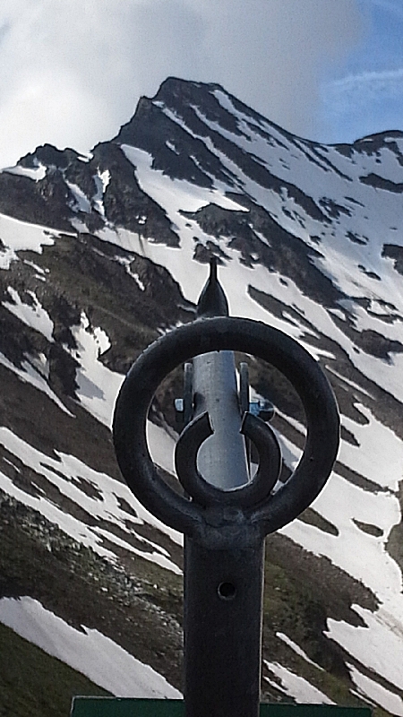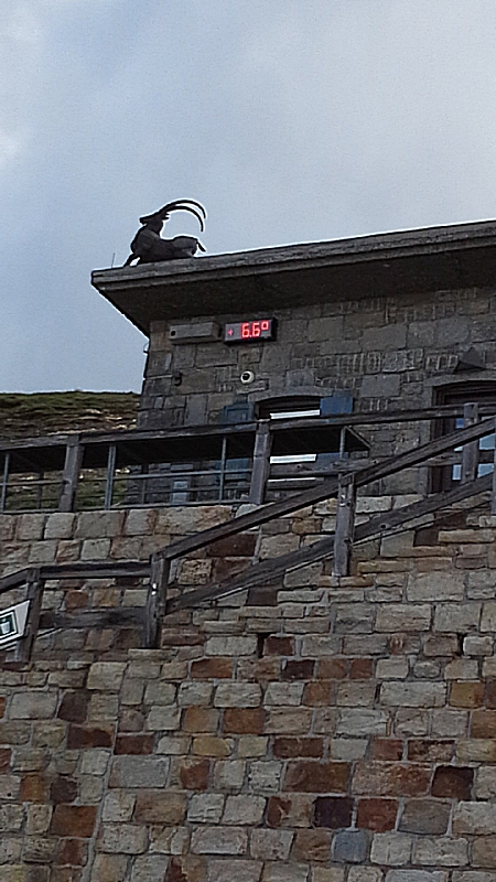 И вот наконец мы делаем остановку на большой площадке. Это еще не самая высокая точка дороги, впереди перевал Хохтор с высотой 2504 м, но здесь отличная панорамная площадка и высота 2428 м над уровнем моря ну и термометр, на котором видна температура окружающей среды. Сейчас она всего 6.6 градуса. Место это называется Ворота Fuscher Törl — памятник разработан всемирно известным архитектором Clemens Holzmeister. Он посвящён рабочим, умершим при строительстве дороги.