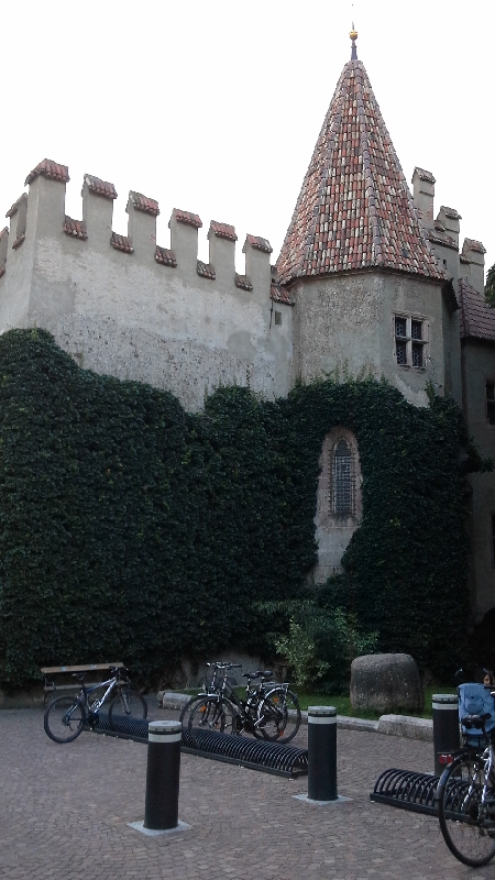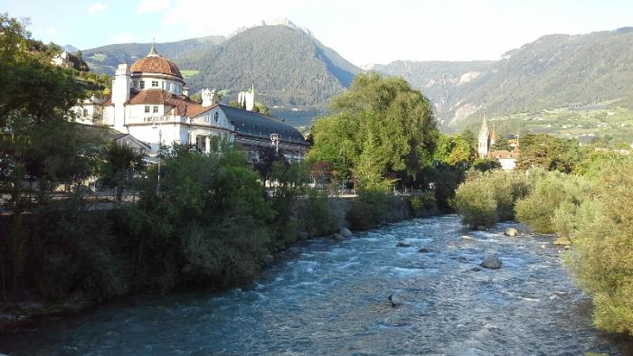 Спускаемся в долину, время уже к вечеру, машин немного да и мотоциклистов почти не встречаем. У нас было запланирован подъезд к тирольскому замку в окрестностях Мерано. Место это в курортном поселке Tirolo изобилует большими и маленькими отельчиками и гостевыми домами, кругом отдыхающие, медленно прогуливающиеся вдоль дороги по пешеходным дорожкам.Но к нашему сожалению увидеть и сфотографировать замок не удалось.Так и не нашли как проехать туда, вокруг пешеходные зоны, на одну из них мы чуть не заехали. Быстро развернулись и начали искать стоянку, чтобы подойти к замку, но бесплатных стоянок с белыми полосами так и не нашли, а ставить на платную машину смысла не было.Надо было еще заехать посетить Мерано.Так и не остановились, поехали вниз к городу. Если кто объяснит как все таки попасть к замку на машине и можно ли это сделать буду очень благодарен-вдруг доведется еще когда-либо побывать в этих местах.Стоянку в Мерано мы нашли легко: в автомобильном тоннеле.пробитом под термальном комплексе указатель сразу ведет нас к подземной стоянке.За 1 час 40 мин стоянки заплатили 3.5 евро. Мерано-довольно известный курортный городок, который был популярен в Европе, особенно в ХIХ веке.Климат здесь благоприятный и целебный; мягкий, чистый и здоровый горный воздух притягивает туристов из разных стран.Город известен своими термальными источниками.Вышли мы как раз к Термальному комплексу.С моста как раз виден Курхаус-водолечебница, построенная в 1914 году.Она занимает довольно большую площадь несколько корпусов с многочисленными бассейнами, наполненные термальной водой, гейзеры и подземные термы.