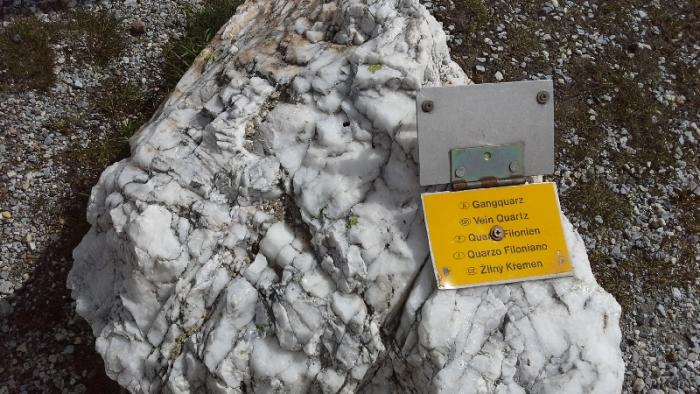 Если посмотреть влево от дороги то наверху находится на высоте 2571 м смотровая площадка. Это так называемая точка байкер-пойнт. Туда ведет крутая узкая дорога, но на автомобиле проехать можно. Мы, к сожалению, просто проскочили этот поворот, а возвращаться было уже неудобно.Жаль, конечно. Оттуда, судя по рекламному проспекту открывается панорама гор на 360 градусов, да и высота приличная. Но мы следуем дальше.Следующая остановка-это музей горных минералов под открытым небом.Можно подойти посмотреть вблизи, названия минералов на 5 языках: немецком, английском, французском, итальянском и чешском.