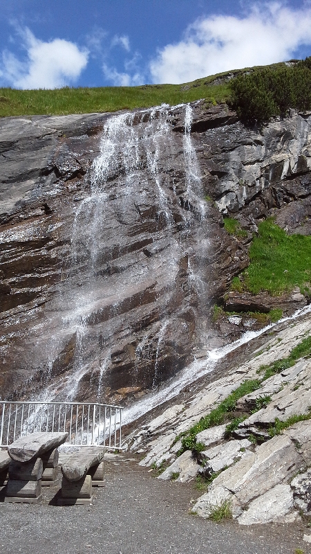 Постояв минут пять, спускаемся по серпантину вниз.С левой стороны замечаем фуникулер.Это Panoramabahn.На нем можно подняться наверх на высоту 2604 м.Но наш путь лежит к леднику Пастерце и к Центр Кайзера Франца Иосифа.По пути встречаются вот такие луга и водопады