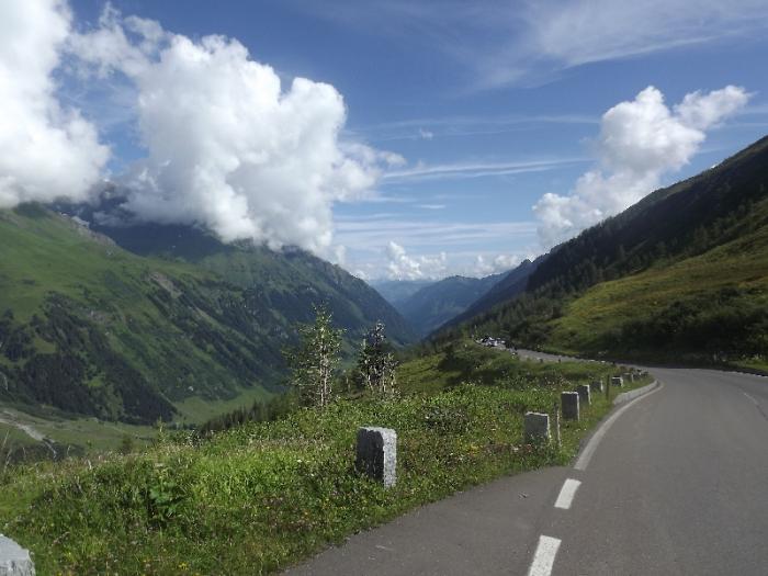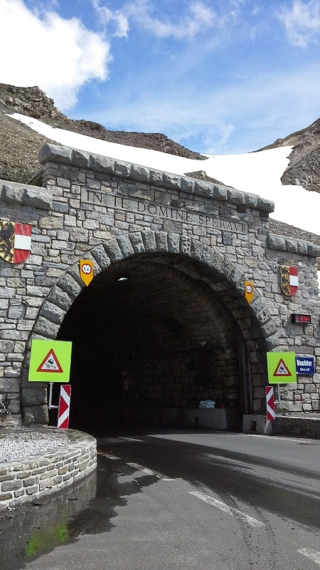 При подъезде к тоннелю Хохтор-наивысшей точки дороги, как впоследствие оказалось и наивысшей точки нашего всего маршрута, очередь машин-тоннель узкий, пропускает в одном направлении.Пришлось постоять минут 10.Дальше нас ждет спуск вниз, но пока можно посмотреть на панораму у выхода из тоннеля. Здесь температура чуть повыше +9.4 градуса