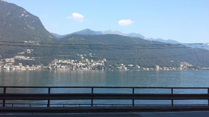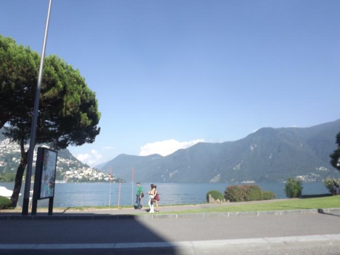 Ну вот с дороги получились такие снимки, подъехать к удобному месту для стоянки и съемки сложно потому что фактически на протяжении нашего маршрута вдоль озера у берегов находились частные территории и приватные стоянки. Да и озеро все мы не проехали потому как путь наш лежал на территорию швейцарского кантона Тичино к городу Лугано. Сразу же как покидаешь озеро Комо, дорога резко поднимается вверх.причем она неширокая и стоит знак, предупреждающий о запрете проезда на туристических автобусах, большегрузных грузовых автомобилях и еще если не ошибаюсь на автомобилях с прицепами(кемперами). Через полчаса езды таможня при въезде на территорию Швейцарии, на это раз таможенники не спрашивали, везем ли мы мясо или вино, я объяснил, что мы едем в Лугано, а оттуда в Италию в Стрезу. В кантоне Тичино проблем с общением не было так как подавляющее число жителей говорит на итальянском языке. Ну вот показалось еще одно озеро на нашем пути Lago di Lugano