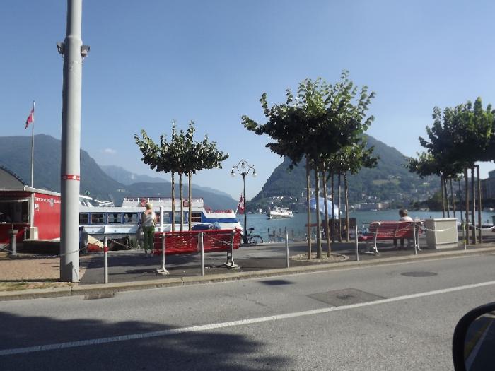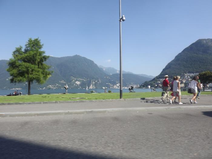 На берегу озера раскинулся знаменитый фешенебельный курорт Лугано.Климат и растительность здесь субтропические и разительно отличаются от остальной Швейцарии.Гольф, яхты, виндсерфинг, комфортный климат, отличный сервис «пятизвёздных» отелей — вот что привлекает в эти края обеспеченную публику со всего мира.Нашей целью посещения Лугано конечно же был парк«Швейцария в миниатюре».Заехав в город и покружив по его улицам, мы решили, что сначала посетим парк, а на обратном пути сам город.Тем более, что остановиться хотя бы на пару часов в Лугано смысл был.Хотелось погулять по набережной, побывать в парке Чивико с виллой Чиани.А пока на подъезде к Мелиде, где размещен парк«Швейцария в миниатюре» пришлось довольствоваться видами на озеро Лугано из окна автомобиля так что прошу прощения за снимки