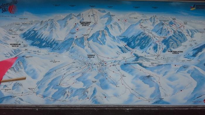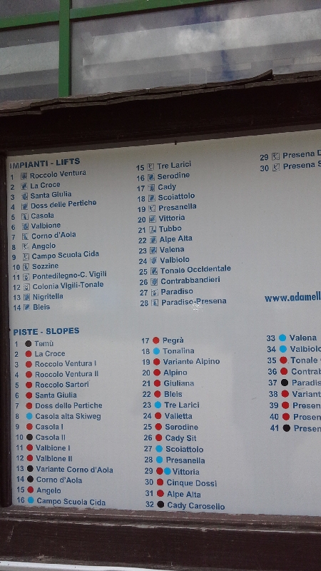 А еще наверху есть галерея-музей Suoni e voci della Guerra Bianca.спускаешься вниз по железной лестнице и попадаешь в темную пещеру, слышны звуки выстрелов, взрывов, голоса итальянских солдат. Также под стеклом образцы оружия, вещи, одежда воинов.Галерея так и называется звуки и голоса Белой войны. Мрачно, немного сыро и холодно, но интересно, долго там не пробудешь, выходим, бросаем последний взгляд на перевал, уходящих вверх по каменистым россыпям туристов в сопровождении инструктора, садимся в кабинку и спускаемся вниз. Ну а при выходе мы увидели стенд, встречающий желающих подняться вверх с изображение трасс и подъемников Adamello ski.