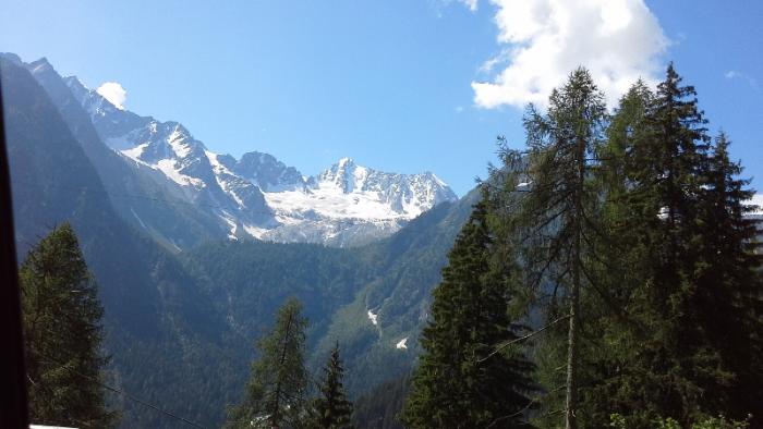 Поговорил с дочерью хозяйки, молодой женщиной, которая еще и обслуживала в столовой туристов.Она предлагала мне воспользоваться возможностью посетить ближайшие живописные туристические места и в частности жемчужину Доломитов Брента-Мадонну- ди- Кампильо и близлежайшие озера Tovel и Santa Guistina.Заманчивое предложение, но пришлось поблагодарить и сказать, что в следующий раз обязательно заеду к ним и посещу окрестности.А чем черт не шутит? Поблагодарив гостеприимных хозяек, попрощавшись, мы продолжили свой путь. он лежал в сторону перевала Passo di Tonale.Снова проезжали мимо городков с яблочными садами и местами переработки урожая, проехали мимо виадука по которому ходит поезд Тренто-Мале, высокий такой виадук, фото не делали но на Google map можно посмотреть.После поворота началась долина Val di Sole (Sole –название долины, происходит от имени кельтской богини Сулис (Sulis), которую римляне отождествляли с Минервой. Она защищала воды долины. а вот и поворот на знаменитый горнолыжный курорт Мадонна-ди-Кампильо.Курорт завоевал славу дорогого аристократического курорта еще в ХIX веке.Сначала на месте старого монастыря появился отель, через несколько лет была проложена дорога, в 1948 году первая канатная дорога подняла горнолыжников на вершину Монте Спинале.Позади остаются альпийские курортные городки Male,Dimaro,Vermiglio.начинается более крутой подъем на перевал.И вот нашему взору открывается великолепная картина заснеженных горных вершин. Это территория Национального парка Адамелло Брента с вершиной-горой Presanella высотой 3558 м над уровнем моря.