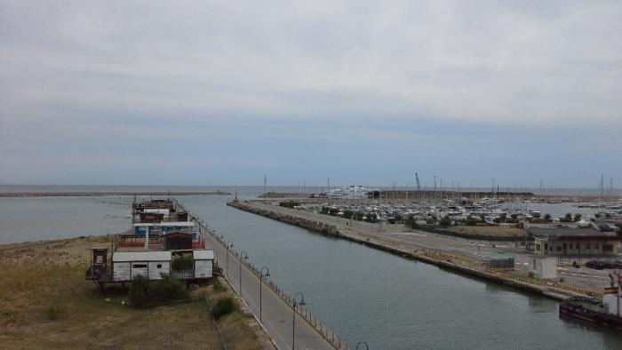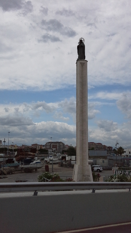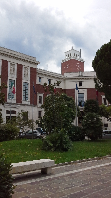 А вот на следующий день нам пришлось обойтись без моря. Причину поднятия красного флага запрета купания мы так и не поняли до конца. Да, можно сказать, что подпортилась погода, облака, пасмурно, море немного взволновалось, но и на следующий день, когда уже не было волнения на море и светило солнце, хотя облачность была переменная, флаг оставался висеть. У меня есть еще одна версия, того, что купание было запрещено: активность медуз.Дело в том, что накануне Света получила ожог от деятельности стрекательных клеток медузы.Меня сия беда миновала, если не обращать внимания на соприкосновение одномоментного, которое не доставило мне серьезных неудобств. Считайте, что я даже не обратил внимания.на сей факт.После завтрака садимся в машину и едем в Пескару раз купаться нельзя. Но перед выездом заехали набрать воды.Да не удивляйтесь.В Италии был не раз, но здесь в Сильви Марина увидел автоматы по продаже чистой питьевой воды. Стоит это 5 евроцентов за литр, а если учесть, что постепенно монеты эти выходят из обихода, то тут как раз они и пригодятся. Вода 2х видов с газом и без газа. Еще вечером, когда гуляли заметил, что местные на велосипеде приезжают и набирают пластиковые бутылки в количестве от 4 до 10, грузят все это в корзинку и едут дальше по своим делам. Вода вкусная, холодная, в жару самый раз. Ехать до Пескары 15 км, но дорога идет по городской зоне и часто на пути светофоры.Наконец мы подъезжаем к вокзалу, где ставим машину на стоянку.Пескара(Pescara) — столица одноименной провинции, крупный культурный, транспортный и портовый центр Абруццо, который находится на побережье Адриатического моря всего в 155 км от Рима. Это самый крупный город в регионе, который славится своим 16-километровым песчаным побережьем, богатой ночной жизнью и обилием достопримечательностей.История Пескары берет свое начало в далекой древности – еще во времена Римской империи на берегу реки Пескара было основано поселение под названием Викус Атерно, ставшее важным связующим звеном между Римом и Адриатическим побережьем. В городе базировалась часть римского флота, а также активно развивались рыболовство и торговля с восточными странами. Экономический расцвет подстегнул расцвет культурной жизни – в Викусе Атерно построили несколько храмов, в которых помимо римской религии процветал культ богини Изиды.
