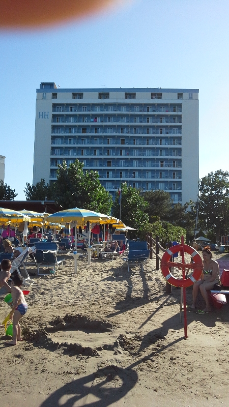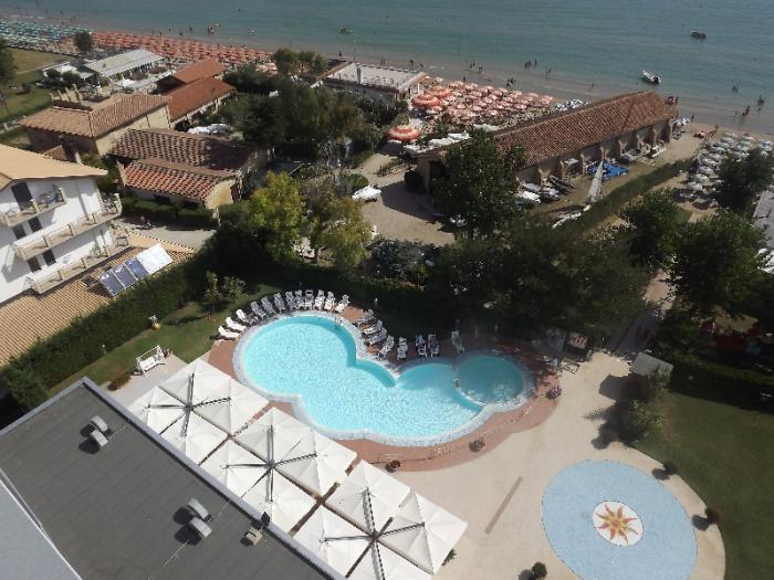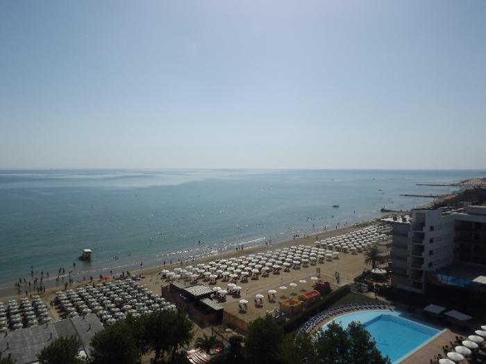 Отель 4-х звездочный, особенность его как впрочем и других отелей в этом регионе, то что 90% проживающих там-это итальянцы, приехавшие на море отдохнуть в июле-августе из разных регионов Италии преимущественно центральных.На стоянке стояли машины исключительно с итальянскими номерами из провинций Аквила, Аоста, Верона, Падуя, Перуджа и многих других. Моя машина была единственной на стоянке с не итальянскими номерами. По крайней мере других не видел. Итальянцы здесь были как у себя дома: для них был полный пансион, все пляжные атрибуты: зонтик, лежак и стулья(все это входило в стоимость их проживания здесь), ну и конечно анимация в течение всего дня на пляже, а вечером на площадке рядом с бассейном. В общем праздник весь день. Но для них все это стоит недешево.Света даже перевела стоимость проживания за 1 день одного человека на наши деньги порядка 7 тыс рублей. Так ли это или нет? Не проверял, у нас же в стоимость входил завтрак, проживание но за всех членов команды. За пляжную атрибутику приходилось платить отдельно 18 евро в день за место. Но несмотря на все эти нюансы отель и сам курортный городок-хороши.