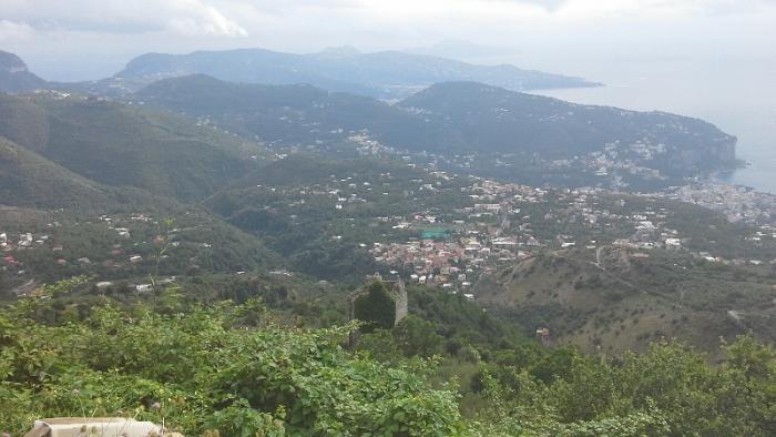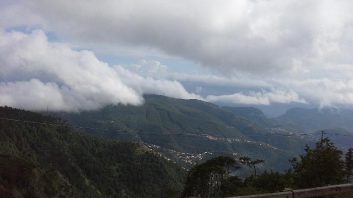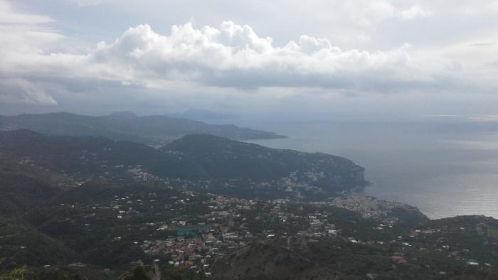Тут находился ресторанчик и отель. Хозяин Стоял тут же у входа, завидев нас он тут же понял, что мы собираемся покушать и пригласил нас. На верху было холодно, Света с Катей оделись потеплее. Пиццы правда не было, но все остальное было на уровне. В этих краях распространены блюда из помидоров, так что помидоры были везде и в пасте и брускетта была с помидорами.отдали за все 47.5 евро. Немного поговорили с хозяином о причинах закрытия фуникулера. Ответ банальный-нехватка денег на содержание, мол деньги идут на военные нужды. Ну не знаю как они идут на военные нужды, в Италии бываю наскоками, но то, что на юге страны кризис ощутим сильнее, чем на севере-это факт. Попрощались с любезным хозяином, поднялись немного до самой вершины, где и расположена конечная станция фуникулера.Высота эта 1131 м над уровнем моря. Начали спускаться вниз, но уже по более хорошей дороге и с другой стороны.По сути дела при спуске внизу перед нами было уже Амальфитанское побережье