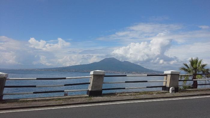 На следующий день у нас по плану была поездка в Казерту в регион Кампанья неподалеку от Неаполя.Решено было ехать по местным дорогам, чтобы почувствовать красоту региона. Путь наш проходил через живописные провинции Кьети, Аквилла, Изерниа, по территории национального парка региона Абруццо-Майелла. По мере приближения к Казерте по пути сплошной чередой пошли маленькие городки Кампании, с большим количеством машин на дорогах. Не секрет, что регион Кампания по численности населения самый густонаселенный регион Италии. Небольшое отступление по бензину. Здесь на юге можно встретить заправки, где бензин senza piombio продавался по цене 1.68-1.7 за литр, в отличие от болле северных регионов.Мы заправились в Казерте за 1.699.Как обычно на 50 евро самообслуживанием, при таком способе заправки бензин чуть дешевле на 0.2-0.5 центов за литр. Подъезжаем на стоянку в Казерту и тут оказывается, что охранник на стоянке нам заявляет, что и дворец и парк сегодня не работают. Завтра пожалуйста, а сегодня нет. Вроде как накануне что-там во дворце было, какое то мероприятие коих в Италии полно. Облом полный. Ведь в королевском дворце и парке чудесные виды. Выходит зря проделали такой далекий путь.Что оставалось делать?.. В Неаполь на пару-тройку часов смысла ехать абсолютно не было.Он требует к себе более пристального внимания как и Флоренция, Рим, Милан, Верона, Венеция.В Помпеи можно было съездить, но дело в том, что у меня множество фотографий оттуда, после первой поездки в Италию в составе туристической группы. Еще при разработке маршрута вторым пунктом в районе Неаполя был подъем на фуникулере на гору Монте Файто, откуда открываются великолепные виды на Неаполитанский залив и на вулкан Везувий. Так и сделали, настроил навигатор на городок Кастелламаре дель Стабиа, у подножия как раз этой горы и находится станция фуникулера. Но по дороге еще надо было пообедать.А так как мы находились в районе Неаполя что надо было пробовать? Ответ напрашивался само собой-Знаменитую неаполитанскую пиццу. Проезжали по городкам в пригороде Неаполя, но время то было как раз с 14 до 15 часов и все пиццерии увы были закрыты. В Италии это характерно. Но зато вот такой вид открылся нам как только мы приблизились к морю