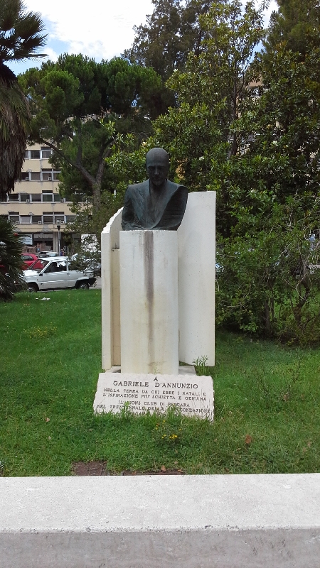 Его произведения были пропитаны духом патриотизма, это было нужно, то что заучивалось солдатами сражающимися с Австро-Венгрией.И в то же время о нем говорят, что это Поэт, превративший свою жизнь в литературную мистификацию. Беспредельно любимый женщинами эстет. Аристократ, дуэлянт, циник, романтик. Он пил вино из черепа девственницы, носил ботинки из человеческой кожи, слыл самым отчаянным и удачливым любителем женщин в Италии. И всеми возможными способами стирал границы между поэзией и реальностью. Вот такой занимательный персонаж был этот d`Анунцио, он же еще много сделал для своего города, занимаясь общественно-политической деятельностью.Естественно в городе его очень уважают, есть дом-музей, в котором воссоздана обстановка родительского дома писателя.