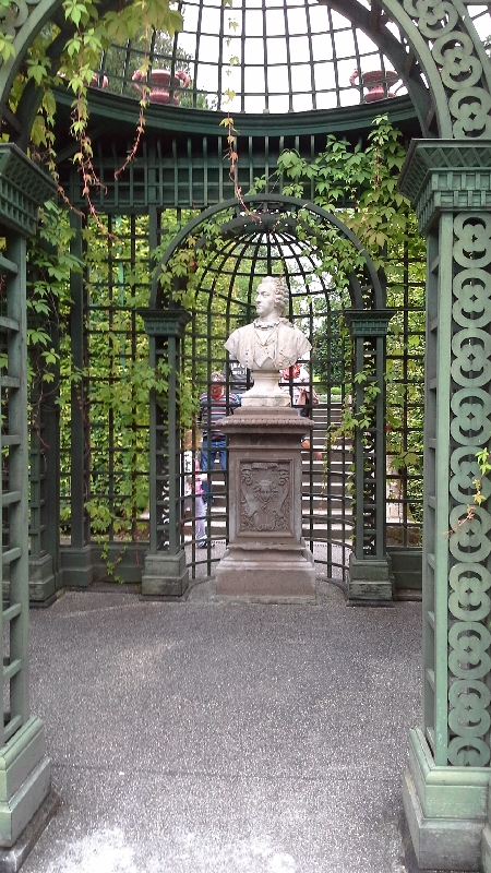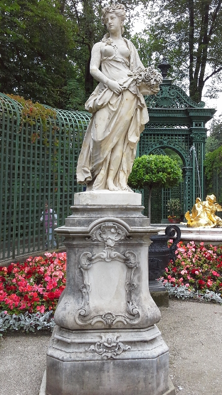 Шеренги высоких буковых деревьев окаймляют нежные насаждения французского садика.В центре клумбы красуется скульптурная группа«Венера и Адонис»