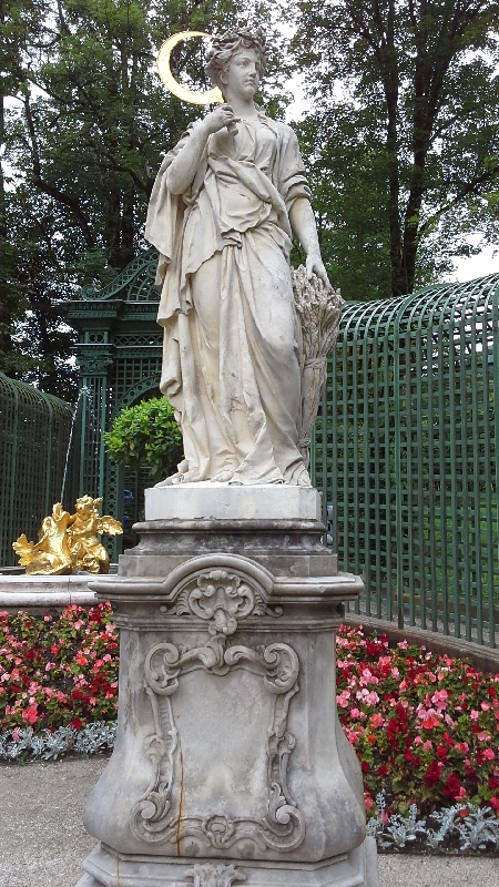 В орнаменте бассейна распахнула свои крылья статуя Молвы, отлитая из позолоченного цинка.По обе стороны от нее установлены каменные статуи-аллегории на времена года.