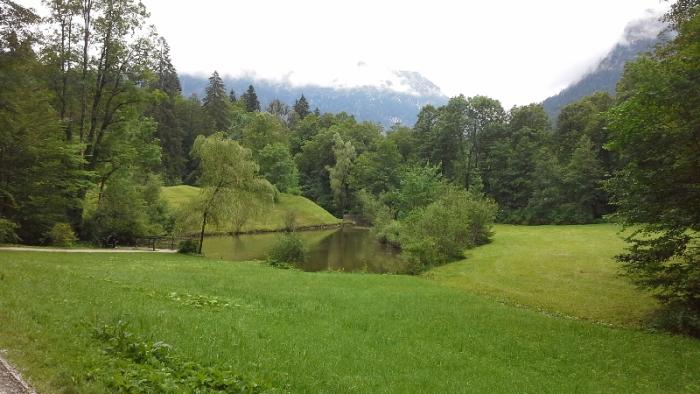 Спускаемся уже по другой дорожке, она пошире и по ней на курсируют экипажи повозок с лошадками, правда мы не увидели их ввиду уже позднего времени, наша экскурсия была последняя.Пошел дождик, а по пути мы увидели озеро Альпзее