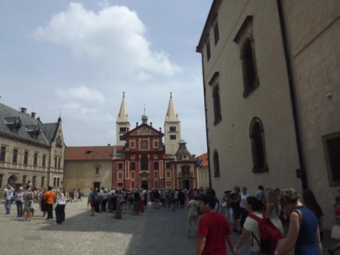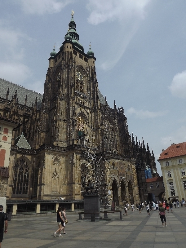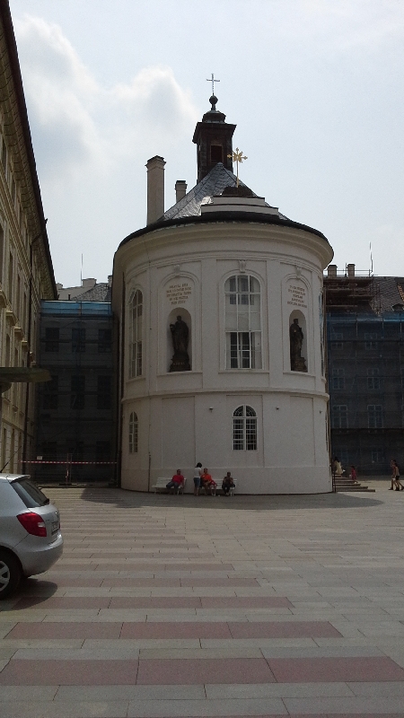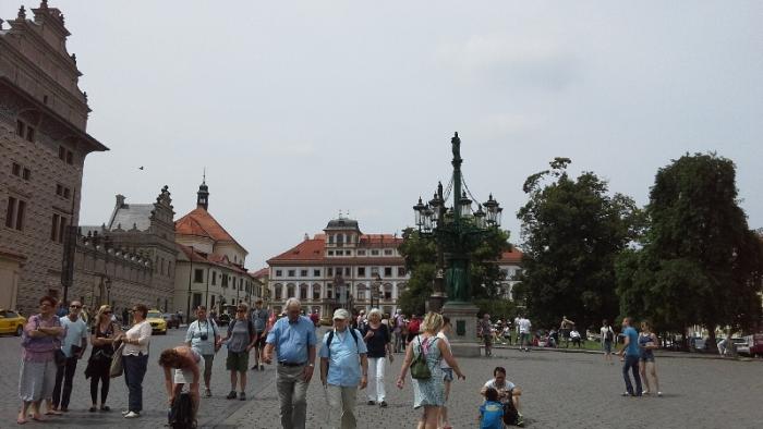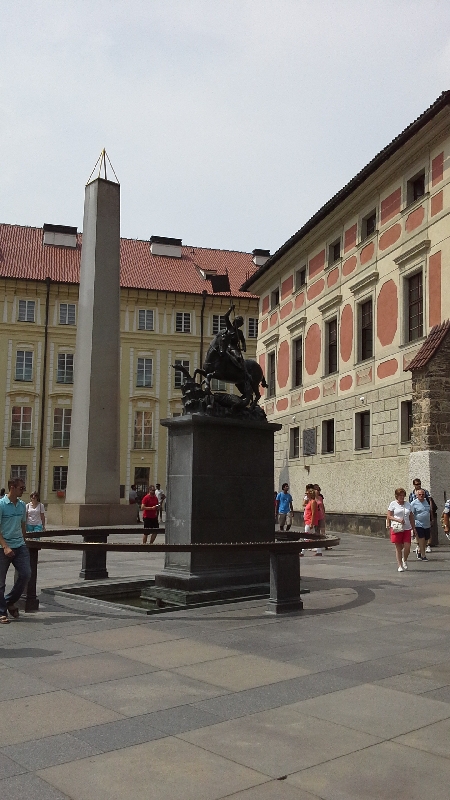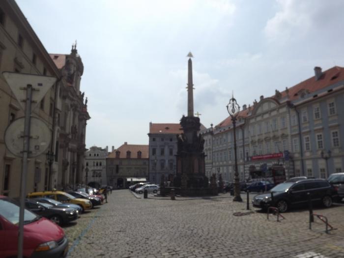 3-й двор Пражского града и обелиск, посвященный жертвам Первой мировой войны.Пора возвращаться к своему автобусу, можно было бы еще погулять и остаться здесь, но экскурсия не закончена, автобус еще поедет в район Малая Страна.Напоследок подошли к смотровой площадке, откуда открывался великолепный панорамный вид на Малую страну и на центральную часть города Малостранская пл Собор св. Николая