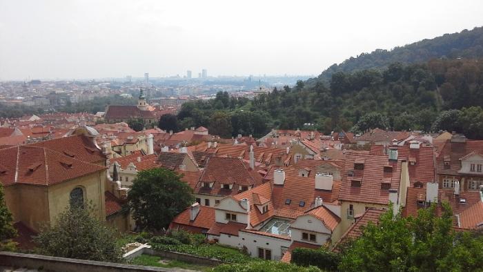 Перед отелем удобная парковка несколько мест принадлежат отелю.Оставляем машину на все время прибывания в Праге, т.к судя по предыдущим многочисленным отчетам по городу надо передвигаться или пешком или на трамвае.Отель расположен в районе Витков. Вот такой вид открывается если открыть фрамугу окна, выходящего на крышу