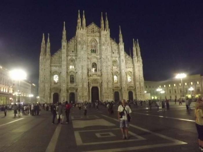 В Милане сели на метро, доехали до Соборной площади. Вышли на поверхность и сразу увидели чудо – сказочный дворец. Таким предстал перед нами кафедральный собор – Дуомо. Величественный, украшенный кружевными башенками и скульптурными композициями, он в фантастическом синем свете вечерних сумерек показался нереальным, словно картинка из сна. В общем, трудно было поверить, что мы – в Милане.