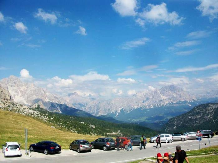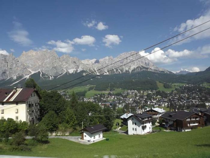 Мы проезжали мимо горнолыжного курорта Cortina d'Ampezzo. Необыкновенный пейзаж. Отели на фоне зелёных гор, а над ними высятся острозубые серебристые вершины, среди которых гора Monte Cristallo (3221м). Курорт стал широко известен за пределами Италии после проведения в 1956 г. на его высокогорной базе Зимних Олимпийских игр. Многие спортивные сооружения сохранились на курорте ещё со времён проведения Олимпиады. Например, Ледовый стадион. На этом знаменитом горнолыжном курорте проводились съёмки голливудских фильмом, например, фильма «Скалолаз» с Сильвестром Сталлоне.