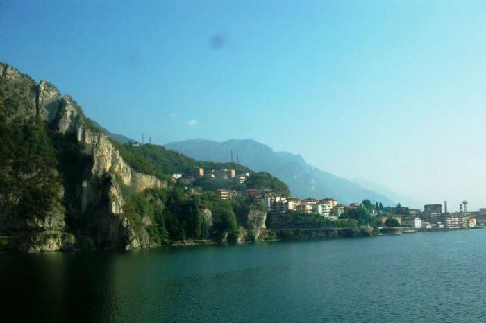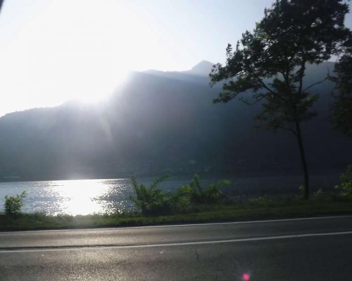 Готовясь к поездке, мы выбирали интересные, живописные места, поэтому свернули к озеру lago di Iseo.Необходимо было проехать небольшую гору и спуститься к озеру. Особенность дороги вдоль озера – узкая, в некоторых местах приспособленная для проезда только одной машины. Слева нависают скалы, справа – озеро. По пути встречаются узкие небольшие тоннели, которые нам напомнили старую дорогу на Красную Поляну, ту, что была до 2000 года. Кто ездил, тот меня поймет.