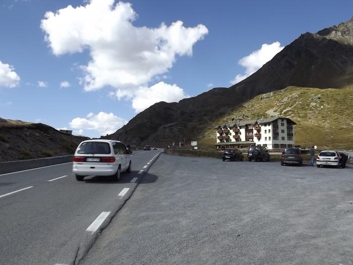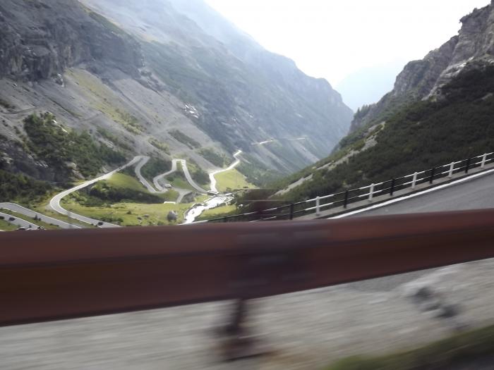 Начался наш путь на самый крутой перевал, один из самых высоких проезжаемых перевалов в Европе и самый высокий (проезжаемый) в Италии –Passo del stelvio. Его высота 2760 м. 61 торнанте – крутых поворота. По дороге на перевал встретили много мотоциклистов, среди них были не только любители, но и профессионалы. Мы ехали над пропастью. Порой дорога шла через тоннели, иногда через галереи, нависающие над скалами. Пара галерей – неосвещенные и узкие, проехать может только одна машина, но нам повезло: встречных машин не было, иначе пришлось бы разъезжаться. Как сказал известный велокомментатор Сергей Курдюков, увлекательно рассказывающий о знаменитой велогонке Giro di Italia, местные автомобилисты вежливы и даже если уже проехали большую часть галереи, готовы сдать назад, уступая дорогу встречному авто.