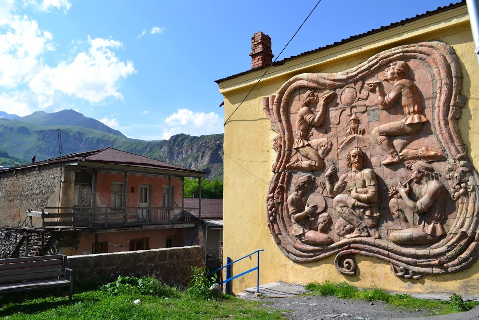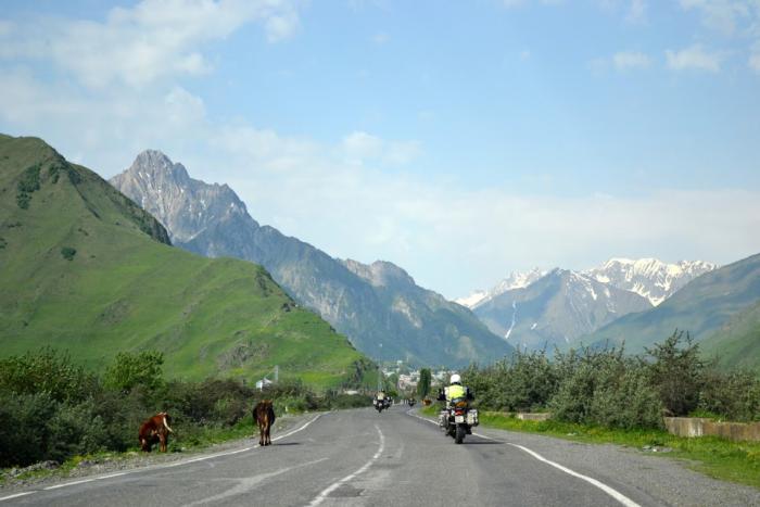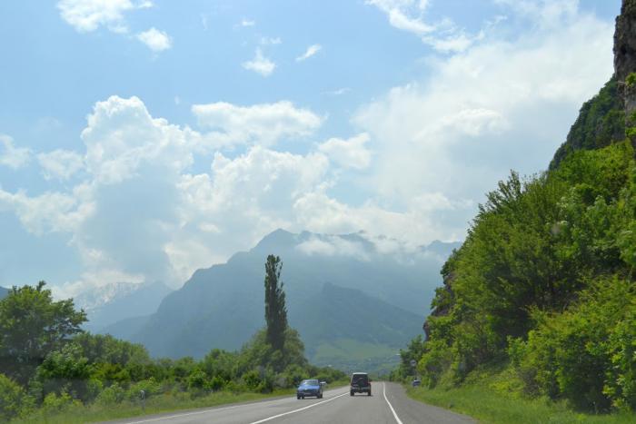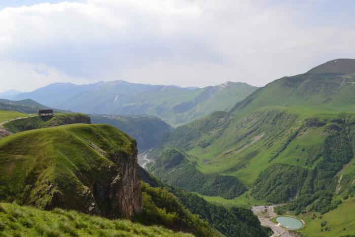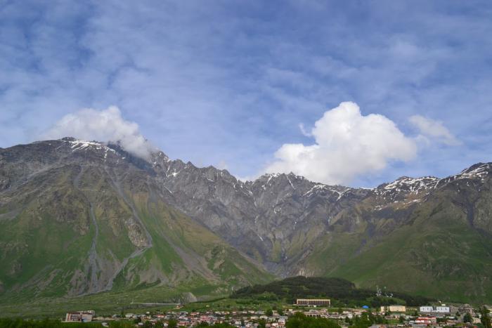 Дорога на Степанцминду (прежнее название — Казбеги) по трассе Кавказ проложена строго вдоль гор. Рядом локоток, да не укусишь. Но, наступает момент, когда трасса поворачивает строго в горы, и начинается красота приграничного с Грузией района.