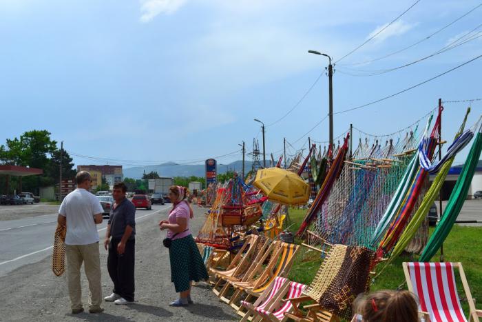 Ещё, я купил таки после Тбилиси вещь, которую долго не мог купить у себя дома – массажно-проветриваемую накидку на сиденья, из деревянных шариков. Раньше они были у многих, но вот уже несколько лет не мог её найти в городе никак. И вот в одном из районов Грузии попалось «поле» придорожной торговли, заполненное гамаками, стульями, накидками и прочими подобными деревянными изделиями. За 20 лари (примерно 500 руб.) стал обладателем этой штуки, что, с учётом жаркой страны, добавило комфорта водителю.