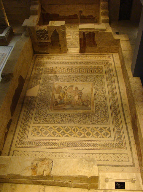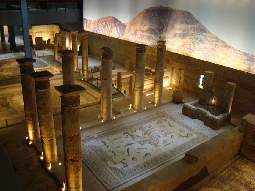 Залы затемнены, тихо играет музыка, прохладно, мозаики перенесены вместе с остатками помещений, где они были открыты. Видно все очень хорошо, и с близкого расстояния, и с балкона. Фото приведу справочно, потому что оставшийся в живых фотик не заточен на режим ночной съемки.