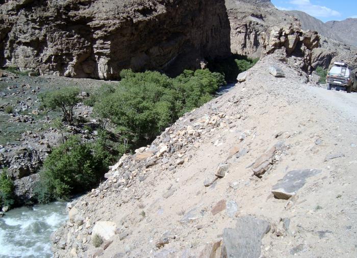 После заправки выехали в сторону юга по Ишкашимской гравийной трассе. Сразу за пригородами нас постращали скучающие пограничники выстрелами из подствольников в сторону афганского берега поверх проезжающих наших машин. Вроде, как шутка, но мы почему-то не смеялись.