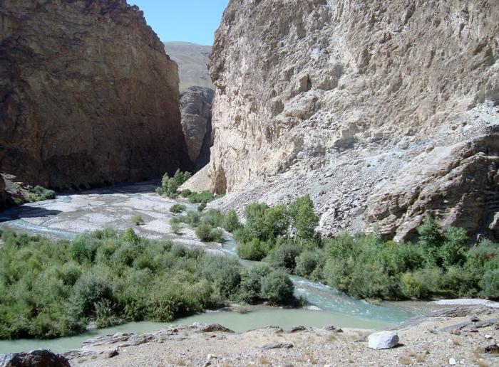 Постепенно ущелье реки Конбай раздвигается и мы выкатываемся в долину реки Шахдары, истоки которой берут своё начало от сверкающих на солнце вершин-пятитысячников Конус и Мац. С высоты 3800 м появились первые чахлые кустарники, а уже на 3500 м водоотводной арык орошает альпийские травы, на которых пасется скот. Около 15-00 часов устраиваем полудневку на берегу чистого и быстрого притока Шахдары речке Дузахдаре.