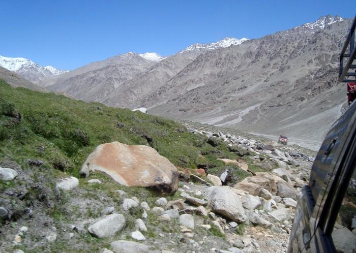 Сразу за поселком Джелонды съезжаем с более менее благоустроенного Памирского тракта и начинаем подъем к озерам Турумтайкуль и на перевал Кара-Гурум. Колея крутыми виражами пробирается по склону, усыпанному мелкими и средними валунами.