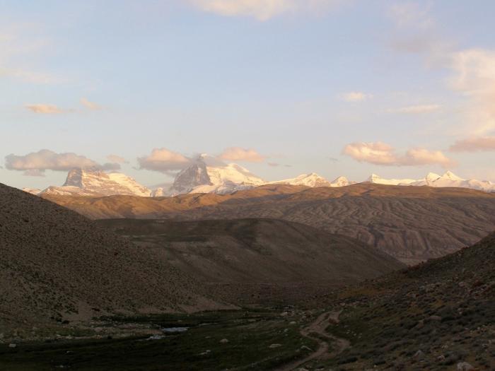 Отсюда открывается вид на Шахдаринский хребет и его главные вершины: пик Маркса (6723 м) и пик Энгельса (6507 м).
