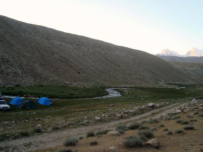Вообще-то, по словам Саида, Дузахдара переводится как Адская долина, может быть Дьявольская. Адским, правда, там был только сильный и холодный ветер. Все остальное легко потянуло бы на звание райского. Изумрудного цвета трава покрывает ровную лужайку, разительно отличаясь от тусклых расцветок более высотных поясов. С севера уютная полянка прикрывается отрогами Шугнанского хребта, на юге – потрясающие панорамы ледников и пиков шеститысячных вершин! Лагерь расположился на высоте 3433 м.