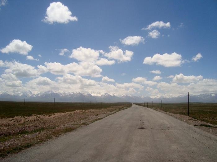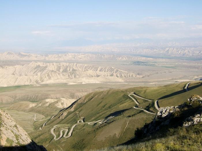 Несколько раз сбиваемся с пути, так как отсутствуют какие-то ни было указатели, а местные жители говорят, что таким путем, как мы желаем, никто на Иссык-Куль не ездит. На выезде из Джелалабада обнаруживаем согнутый и запылившийся указатель, который сообщает, что нужная нам дорога — прямо, но перевал закрыт. Стоящий рядом таксист пояснил, что речь идет о зиме, а сейчас: «Вы должны проехать.» В итоге попадаем на ту дорогу, которая и приводит нас к подножию перевала Калдома (3062 м), за которым, если верить карте проложена колея, ведущая к необходимому нам райцентру. Фото 121. Начало подъёма на перевал Калдома. Фото 122.