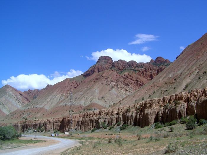 После поселка с таким же названием Гульча, уходим резко влево, чтобы подняться на перевал Чигирчик (2406 м), запомнившийся крутым “тещиным языком” на спуске. Фото 115. На спуске с перевала Чигирчик. Фото 116. Очень киргизский пейзаж.