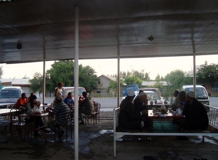 Перекусив в кафе и перевалив хребет Актур, приближаемся к нашей сегодняшней цели – киргизскому областному центру Ош. В город въехали постепенно теряя высоту и по постоянно улучшающейся дороге в 17-00. Городок шумливый, восточный, улицы узкие. Машин много – запрет на правый руль в соседнем Таджикистане спровоцировал вывоз оттуда множества автомобилей японского производства по бросовым ценам. Вывески все на русском языке. Ночуем в гостинице. Проехали за день 270 км. Кто бы тогда мог подумать, что всего лишь через год здесь будет греметь оружие и прольётся человеческая кровь?! Фото 117. Курмажан Датка — киргизская женщина-генерал и правительница. Фото 118. Самса с мясом в тандыре. Фото 119. Перекус в Ошском кафе. 07.08.09. От Оша до озера Иссык-Куль можно поливать по республиканской хорошего качества трассе через Бишкек. Но нам нужно через горы. Мы хотим проехать на это большое озеро, пробравшись через хребет Терскей-Алатау. А для этого необходимо попасть в районный центр Нарын и разыскать путь к перевалу Тоссор. Поэтому, выехав рано утром из Оша, миновав Джелалабад, мы по малопосещаемым дорогам, направляемся в сторону Нарынского района. Фото 120. Въезд в город Джелалабад.