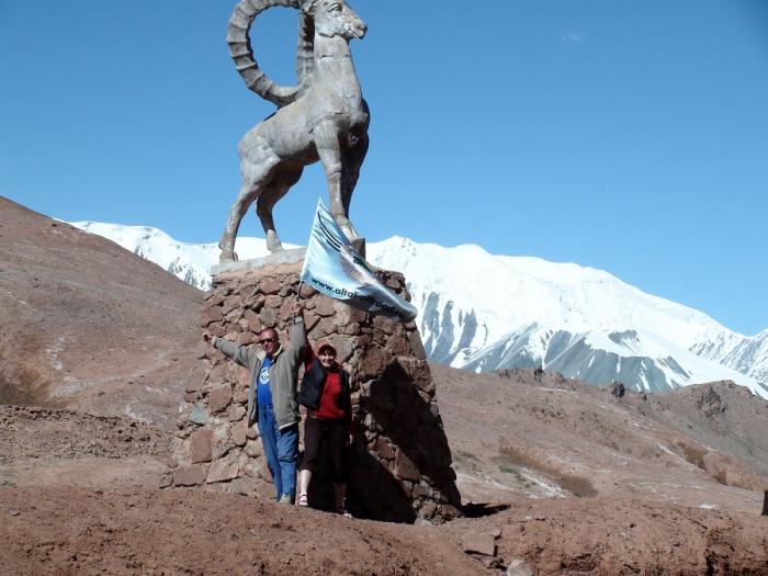 На высоте 4280 метров, на перевальной точке установлена скульптура архара, символичные карты Таджикистана и Киргизии. Мы прощаемся с Памиром. С его молчаливыми горными гигантами, глубокими провалами ущелий, бурными гремящими речками, прозрачными холодными озерами, блистательными снежно-ледовыми вершинами, продуваемыми мощными ветрами безжизненными долинами, солнечными днями, ласковой зеленью оазисов, неприхотливым и гостеприимным народом. Фото 110. Спуск с перевала Кызыл-Арт.