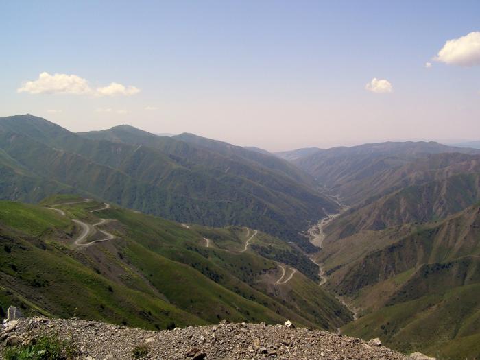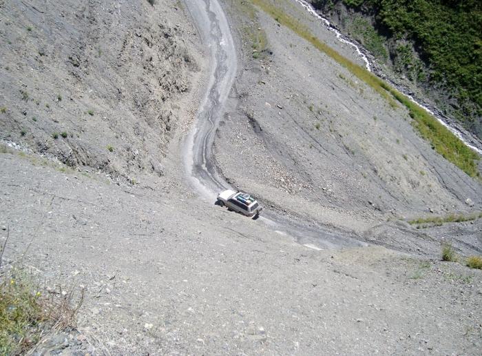 Если не обращать внимание на неблагозвучность названия, перевал поражает своим величием, трудностью и длительностью подъёма, красивыми серпантинами, практически полностью огибающими горный склон. Эти ажурные спирали плотно прижимаясь то к одному, то к другому крутому боку горы, постепенно и несмело приподнимают нас над ущельем, словно собираясь с силами, чтобы потом широкими пологими волнами вознести на вершину перевала. Колея узкая, в одну машину, перед закрытыми поворотами обязательна подача сигнала для предупреждения встречных. Общий подъем от подошвы до верха более 1500 м по вертикали! Фото 123. Дорога на перевал.