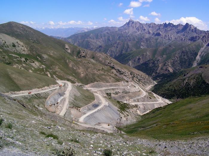 Окружающие пейзажи сменились на более приветливые, теплые и мягкие тона, бурые Памирские гиганты — на зеленые склоны Тянь-Шаньских гор. Миновав приграничное село Сары-Таш, постепенно вкатываемся на связку перевалов Хатынарт (3541 м) и Талдык (3615 м), с которого открывается потрясающий вид на лихо закрученный хоровод серпантинов. Просматривается почти весь спуск! Перепад высот от вершины перевала до основания составляет около 800 метров. По склонам жуками ползают грузовики и автодорожная техника – ведется полномасштабная реконструкция дороги. Фото 113. Спуск с перевала Талдык 3615 м.