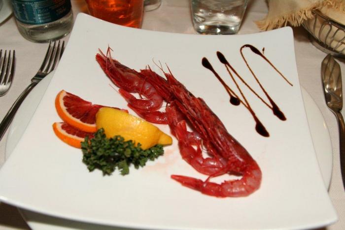 Гамберони — сырые местные красные креветки, подаются с соевым соусом… буквально за 2-3 недели до отпуска, был в командировке в Италии и один мой друг, рассказал мне про это блюдо… очень оригинальный вкус.