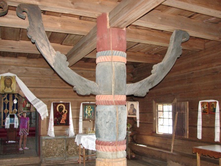 Большой интерес представляет и интерьер здания. Нельзя не поразиться сходству столбов, поддерживающих балки потолка и трапезной, с человеческими фигурами. Крупные, перетянутые в трех местах резными жгутами балки напоминают людей с напряженными под тяжестью потолка мышцами тела и рук. Это явление имеет древнее происхождение: изображение женщины-богини с поднятыми вверх руками встречалось при археологических раскопках древних поселений славян-язычников; такой мотив часто присутствует и в старинных народных вышивках. Эти столбы задают тон всему интерьеру трапезной.