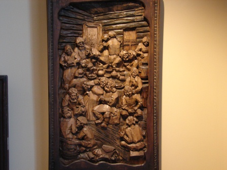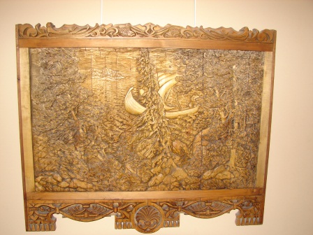 После обзорной экскурсии по мраморному карьеру решаем поехать в Сортавалу, посмотреть галерею работ резчика по дереву Кронида Гоголева. Родившийся в 1926 году в Новгородской области, художник почти до 60 лет был живописцем, но в 1980-х годах обратился рельефной резьбе по дереву и создал множество произведений на темы деревенского быта, русского Севера, эпических сказаний прошлого. Рассказ о народном художнике, живом Крониде Гоголеве его дочери Марии можно прочитать здесь: