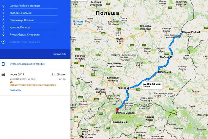 Два навигатора и айфон предложили несколько вариантов перемещения по Польше. Мы сознательно отказались от передвижения до Варшавы – и дальше через Катовице — Остраву. Во-первых, это довольно скучная дорога. Во-вторых, не факт, что быстрая: в прошлом году на участке Катовице – Ченстохова мы больше часа потеряли из-за ремонта дороги. Поэтому решили выбрать нетрадиционный маршрут: через Люблин до Кракова по кратчайшему расстоянию. И совсем не пожалели об этом.