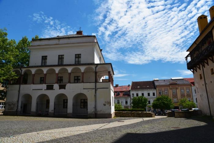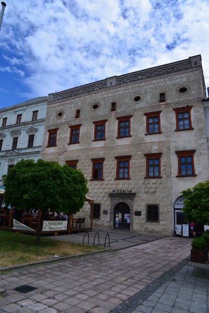 Пятиэтажное строение в центре – это средневековый Matejov dom (Матеев дом) с выбитой на фасаде датой его постройки – 1479 год. Название дома – от имени крупного королевского чиновника. Он тесно зажат между костелом и Горной башней. Вот уже больше века в Матеевом доме находится музей, а проход в сохранившейся крепостной стене ведет… на кладбище. Так что мы, разбежавшись было, повернули назад, чтобы более внимательно рассмотреть еще одно необычное здание на бывшей территории замкового комплекса: