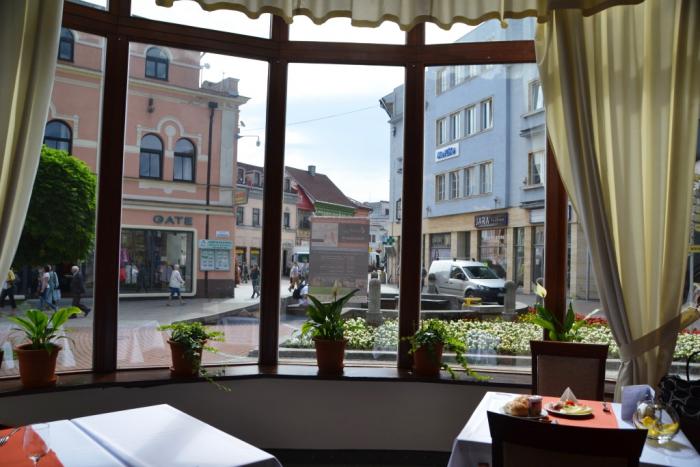Довольно скромный (особенно по сравнению с предыдущим польским) завтрак компенсировался шикарным панорамным окном во всю угловую часть здания отеля: