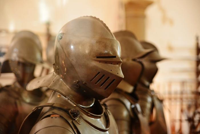 «В романском зале замка XII века наглядно показано настоящее хранилище оружия замка, находящегося здесь и включающее в себя пятьсот единиц холодного, огнестрельного, охотничьего и спортивного оружия, а также защитного снаряжения с XV по XX в.в.»