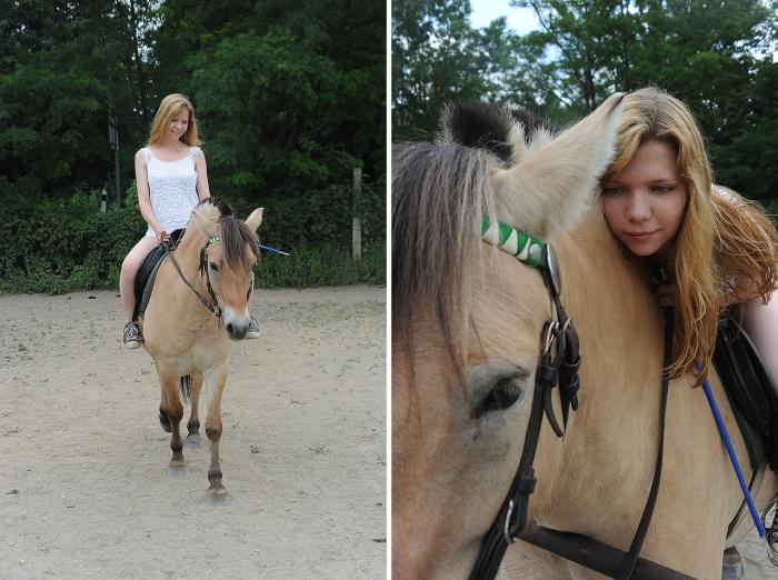 От реализации плана покататься на велосипедах пришлось отказаться: при обследовании парка выяснилось, что большинство дорожек снабжено запрещающими знаками. А там, где можно кататься, очень много собак. Решили не создавать аварийных ситуаций. Машка расстроилась. Пришлось утешить ребенка лошадью. Благо конюшня была присмотрена еще накануне. Дуктяшу оставили в машине – от греха. Лошадка Маруське досталась невысокого росточку, не в пример нашим красавицам из Фрязино. Выглядело это потешно – дылда переросток на детском велосипедике. Да и катались они только по кругу.