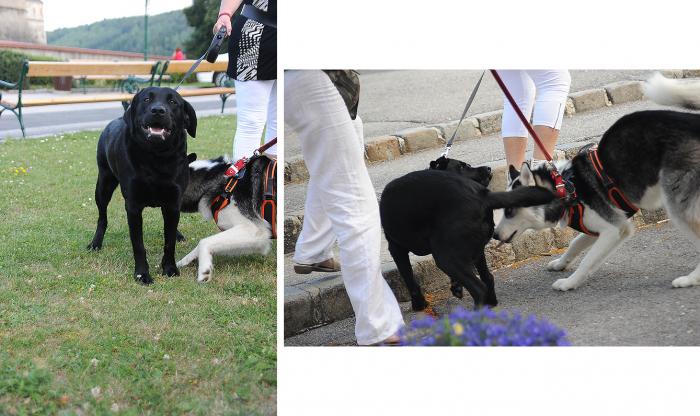 Мы долго не могли разойтись с этим зверем по-хорошему еще во внутреннем дворе замка. Потом он исчез (точнее его с трудом утащили хозяева), и внезапно объявился перед выходом из арки замка. Машка, заметив появление агрессора, рванула вперед,